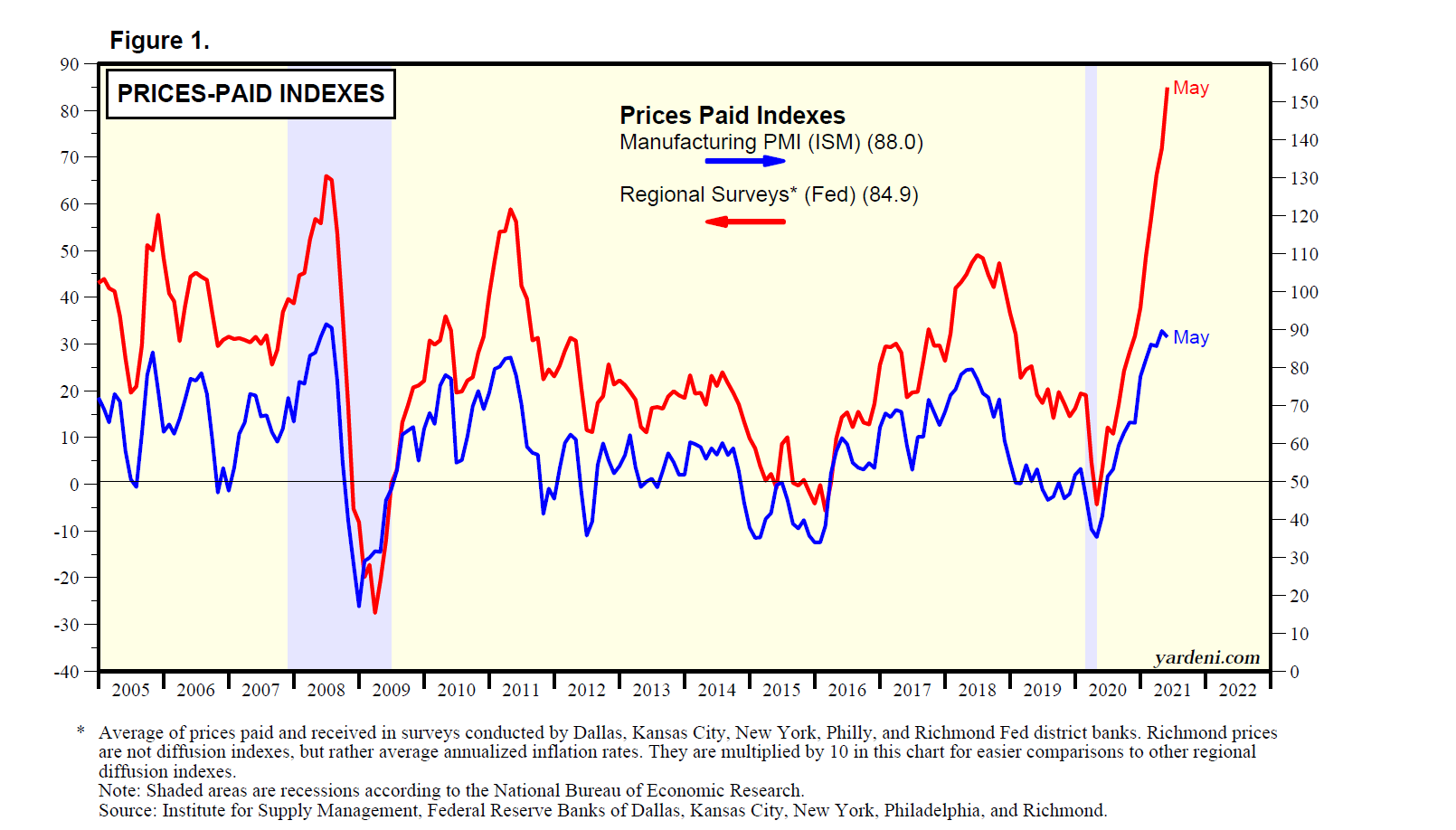 El índice de precios pagados incluido en la encuesta nacional de mayo de gerentes de compras de manufactura (M-PMI) se mantuvo cerca de la lectura de abril, que fue la más alta desde julio de 2008 ( Fig. 1 ). Eso no es una sorpresa, ya que el promedio de los índices de precios pagados de mayo informados en las encuestas comerciales regionales realizadas por cinco bancos de la Reserva Federal saltó a la lectura más alta registrada ( Fig. 2 ). El promedio de los cinco índices regionales de precios recibidos también saltó a un récord en mayo. Los diez índices regionales de precios pagados y precios recibidos se encuentran en niveles récord o cerca de ellos ( Fig. 3 ). (Los datos de las encuestas regionales comienzan en 2005).