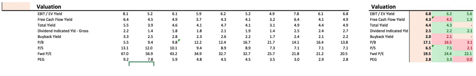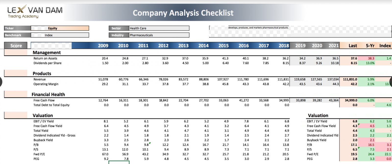 Como se puede observar en la parte superior de la siguiente imagen, que muestra la hoja de Excel a la que nos referimos, esta es una compañía del sector médico que opera en la industria farmacéutica. Como será evidente a medida que avancemos en las otras secciones, estamos interesados principalmente en la tendencia (estimación 2009-2021) y en si el valor actual (‘Último’) está por encima o por debajo del promedio de los últimos 5 años (‘5 años’) y la media del índice (‘Índice’). A efectos de nuestro análisis el color verde es positivo, y el rojo es algo negativo, cuando se comparan los datos.