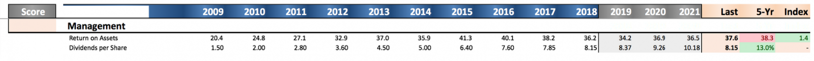 Es fácil quedar atrapado en medio de todos estos números, por lo que iremos paso a paso. Empecemos con la primera sección de nuestra lista de verificación: la Administración de la Compañía. Las cosas definitivamente se ven bien aquí, ya que el ROA es alto de dos dígitos y estable, y existe una atractiva política de dividendos que muestra un crecimiento promedio del 13% (dividendos crecientes). Definitivamente es +1 en nuestra Checklsit.