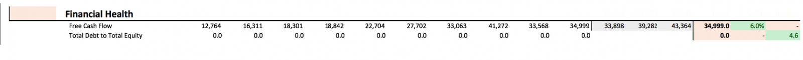Para un negocio en crecimiento con márgenes saludables bajo una buena administración, esperaríamos ver un crecimiento del flujo de efectivo libre, como vemos claramente aquí con un promedio del 6%. Por ahora, las cosas se ven muy bien. Queremos verificar que la compañía no dependa demasiado de la deuda para financiar sus operaciones y expansión. Por esta razón, siempre verificamos la relación de la deuda total con el capital y, como puede ver, la empresa no tiene deuda, con una proporción de 0. Esto significa que su modelo de negocio es autosuficiente, sin depender de acreedores externos. ¿35 mil millones en flujo de efectivo libre y sin deuda? ¡Eso es un +1!