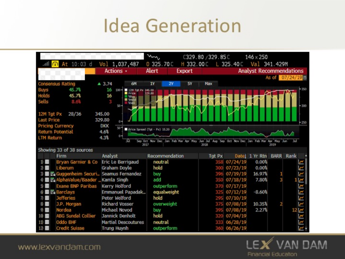 Así que la valoración también es +1 en nuestra Lista de verificación, y todo se ve genial. ¿Pero es esto conocido por el consenso? Después de todo, si todos tienen la misma idea y ya la han comprado, puede ser difícil para la acción apreciarla significativamente. Pero en este caso, como se muestra en la pantalla de Bloomberg a continuación, los analistas están lejos de ser unánimemente optimistas, ¡tal como esperaba ver! Esto significa que todavía hay un montón de analistas que lucharán por mejorar las acciones cuando se despierten a la historia cuando los fundamentos comiencen a transpirar y el dinero inteligente ya haya comprado. Además, los analistas más “precisos” (¿relevantes?) históricamente todos tienen actualmente calificaciones de compra, lo que me hace estar aun más convencido de que pronto seguirá el resto de la manada.