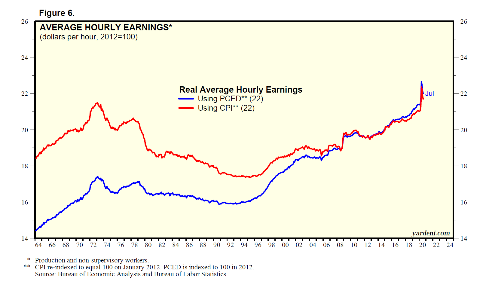 (4) El IPC es muy engañoso. Es bien sabido que el IPC está sesgado al alza, especialmente en comparación con el PCED ( Fig.5). Desde enero de 1964 hasta julio de este año, el IPC subió un 838,5%, mientras que el PCED subió un 646,3%. Como resultado, mientras que el AHE ajustado por PCED ha aumentado en un territorio récord desde enero de 1999, la versión ajustada por IPC no se recuperó a su máximo histórico anterior durante enero de 1973 hasta abril de 2020, lo que no tiene ningún sentido ( Fig. 6 ) (¡Un estudio extremadamente defectuoso de agosto de 2018 realizado por el Pew Research Center concluyó que el poder adquisitivo de los estadounidenses basado en el AHE ajustado al IPC apenas se ha movido en 40 años!)