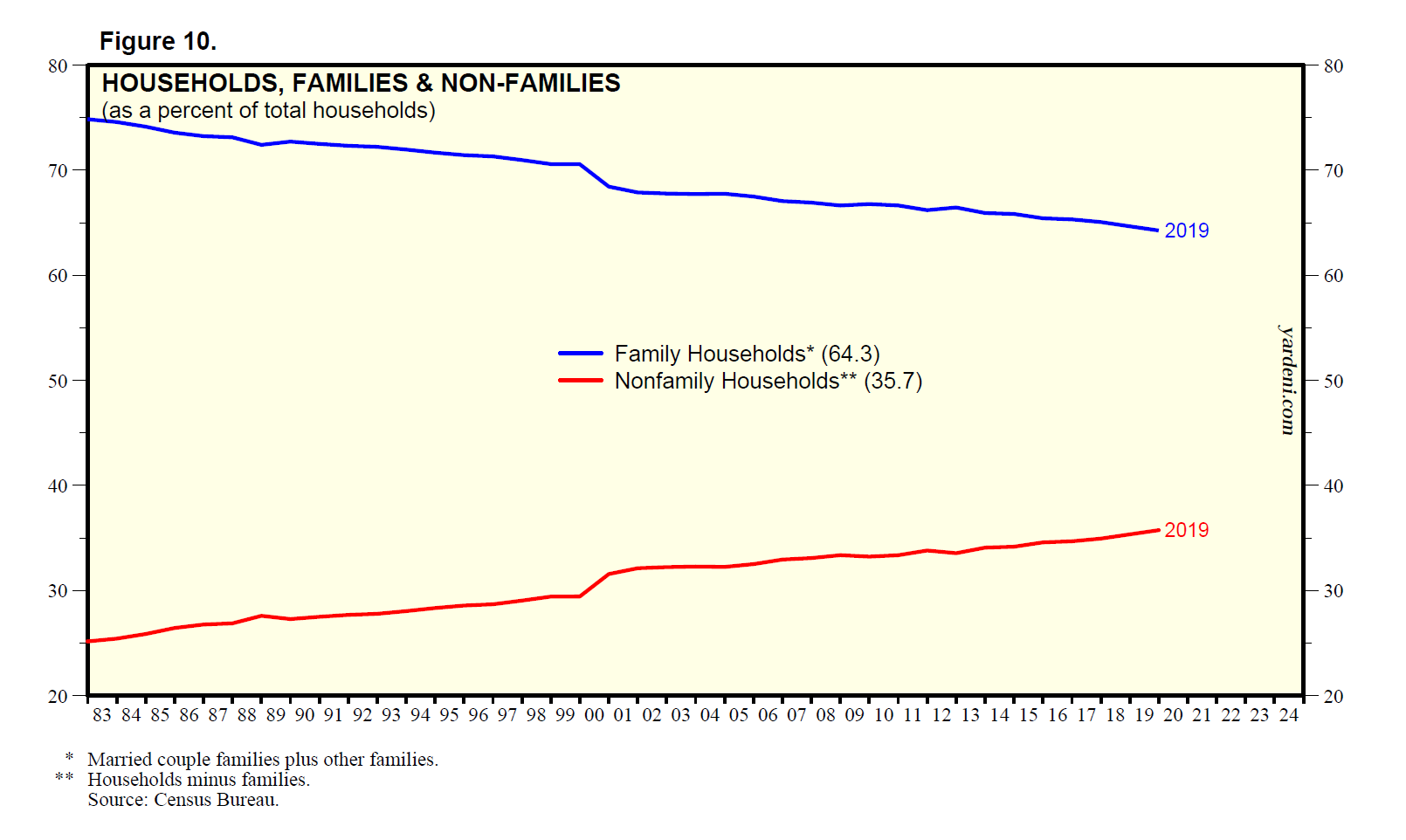Además, los datos disponibles desde 1982 hasta 2019 muestran que el porcentaje de hogares no familiares ha aumentado del 25,1% al 35,7% durante ese período ( Figura 9 y Figura 10 ). Por tanto, hay más de estos hogares que tienden a ganar menos que los hogares familiares. No es de extrañar que los datos del censo ajustados por tamaño del hogar y por inflación utilizando el PCED muestren menos estancamiento y tendencias alcistas más pronunciadas desde el inicio de los datos ( Fig. 11 y Fig. 12 ).
