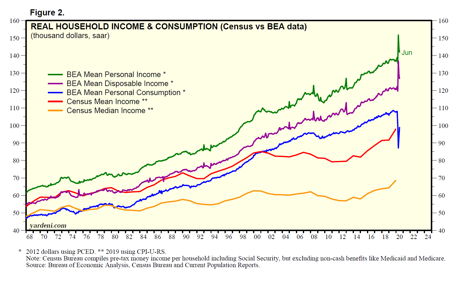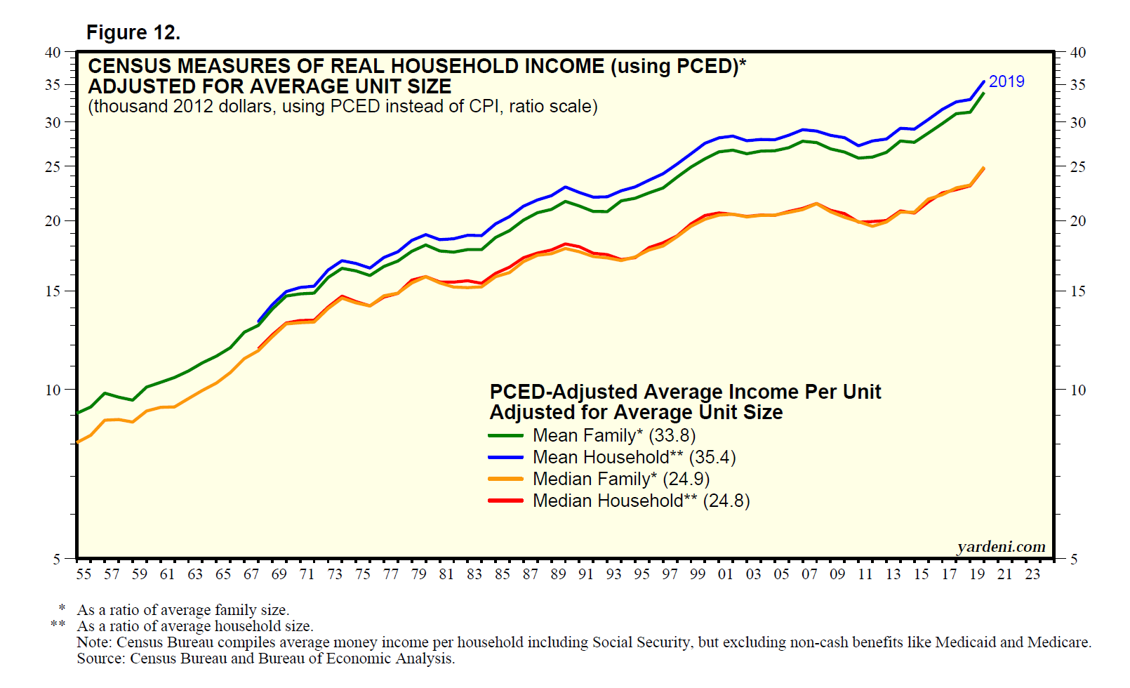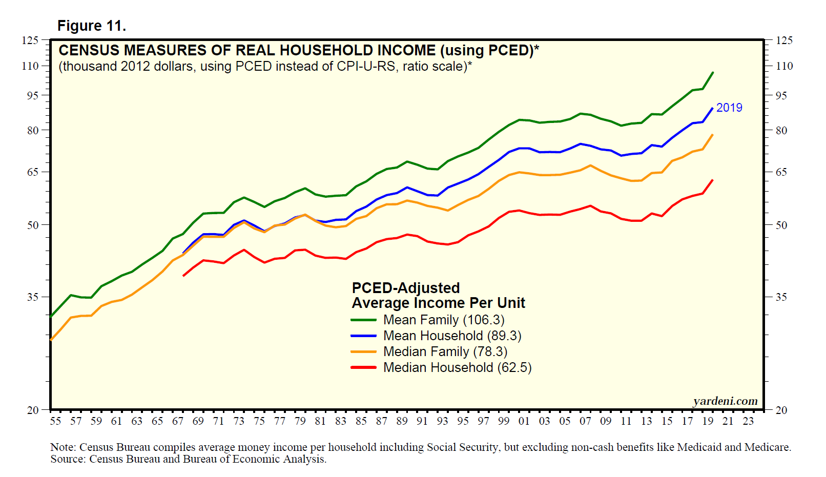 (2) Los datos sobre ingresos personales refutan el mito del estancamiento. Si bien los datos del censo tienen más sentido para mí ahora, todavía tienen muchos problemas. Lo más importante es que los datos del censo se basan en encuestas que solicitan a una muestra de encuestados el monto de sus ingresos monetarios antes de impuestos. Por lo tanto, Medicare, Medicaid, cupones de alimentos y otros beneficios gubernamentales no monetarios, que se incluyen en la serie de ingresos personales compilada por la Oficina de Análisis Económico (BEA), están excluidos de la serie del Censo. Además, los datos de BEA se basan en datos “duros” como estadísticas de empleo de nóminas mensual y declaraciones de impuestos. BEA también compila una serie de ingresos personales después de impuestos que refleja los beneficios fiscales del gobierno, como el Crédito Tributario por Ingreso del Trabajo.