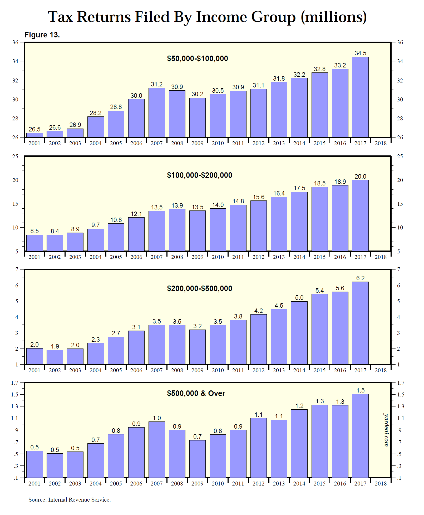 (6) Los ricos no son como tú y yo.¿Qué pasa con el 1 por ciento, que gana demasiado dinero, tiene demasiada riqueza y no paga su parte justa de impuestos? El número total de magnates en Wall Street, en Silicon Valley y en las C-suites de las empresas estadounidenses, incluidos todos los que tienen un ingreso bruto ajustado (AGI) superior a 500.000 dólares al año, fue de 1,5 millones de contribuyentes en 2017, exactamente el 1% de todos los contribuyentes que presentaron declaraciones ese año, de acuerdo con los últimos datos disponibles del Servicio de Impuestos Internos (IRS) ( Fig. 13 ).