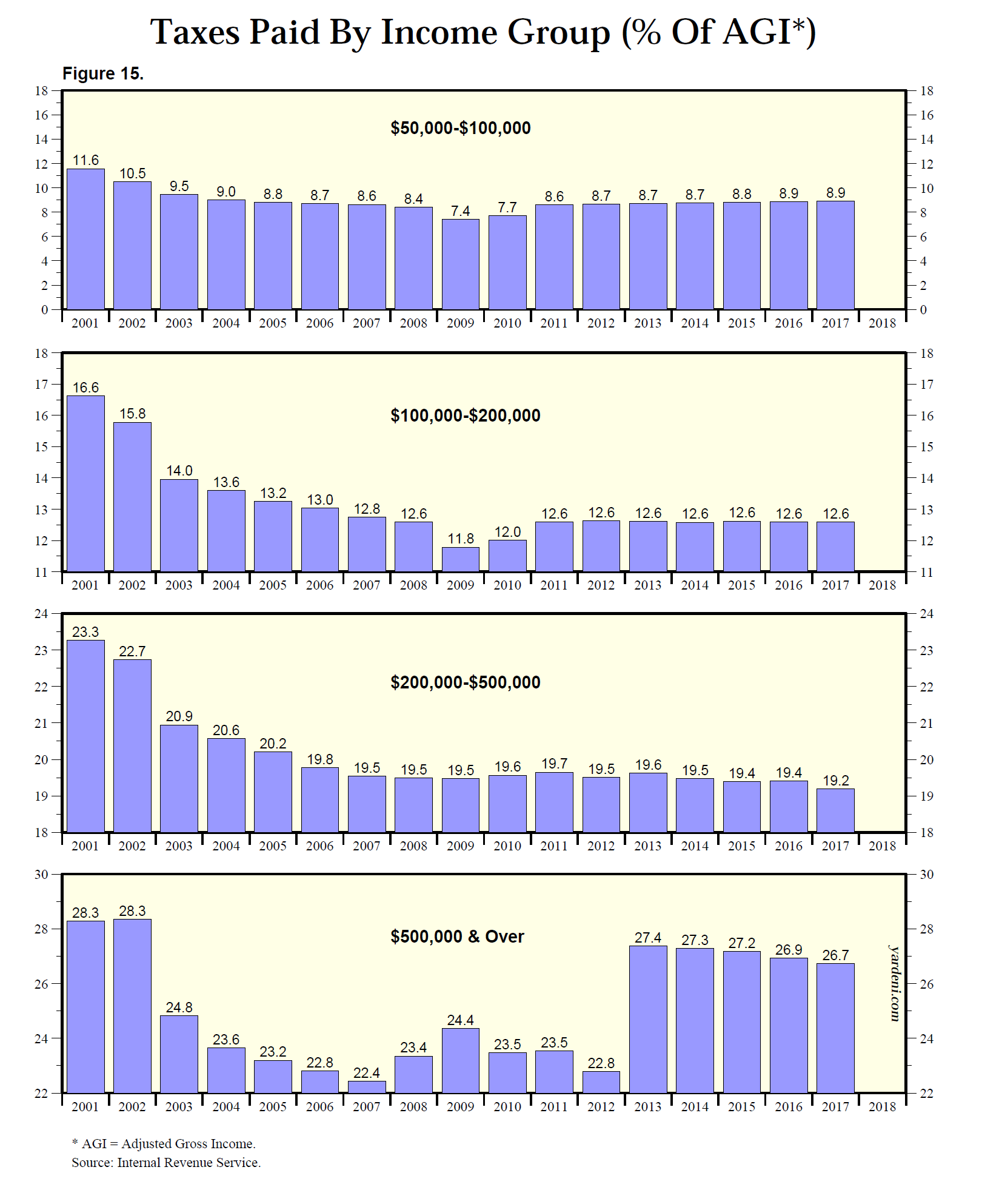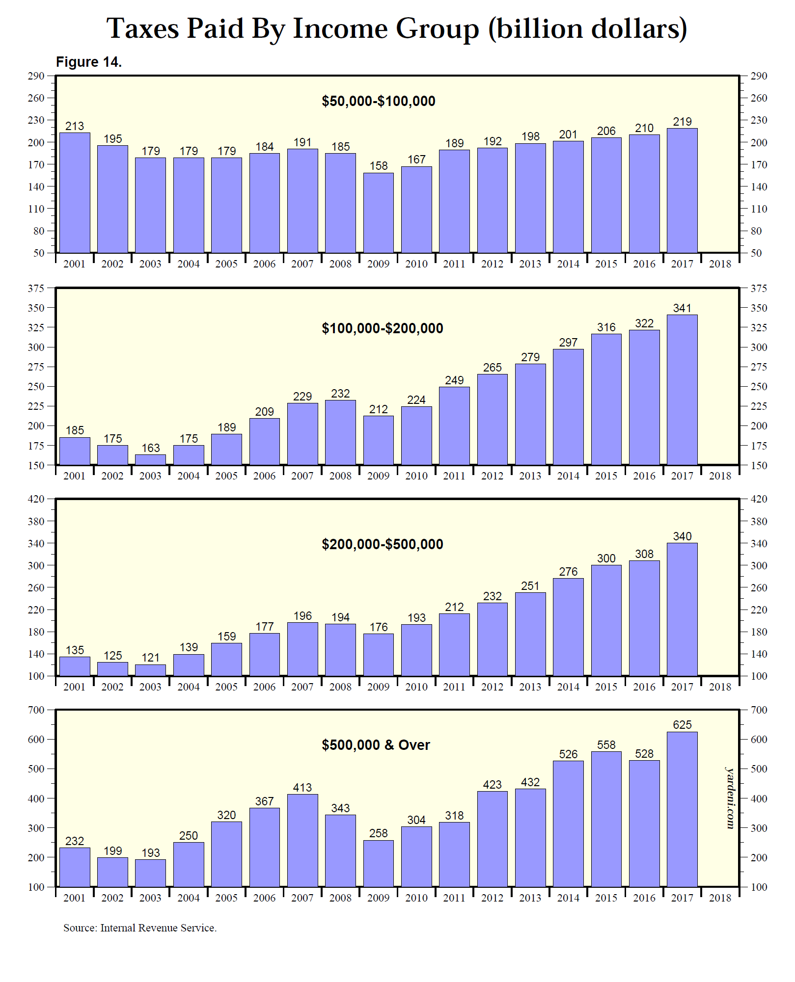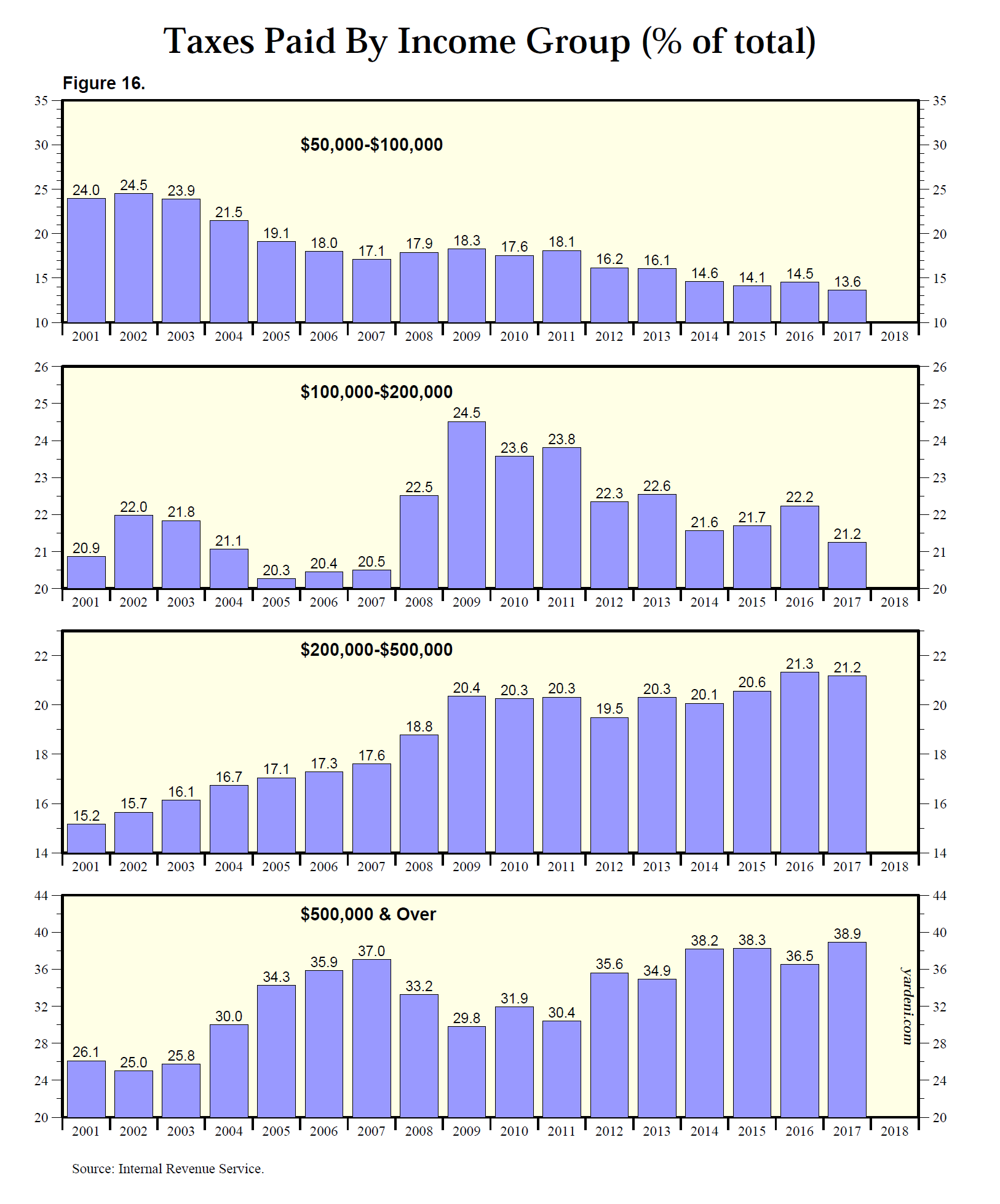 En conjunto, durante 2017, el 1 por ciento pagó $ 625 mil millones en impuestos sobre la renta, o el 26,7% de su AGI. Ese monto representó el 38,9% de todo el impuesto sobre la renta federal pagado por todos los contribuyentes que pagaron impuestos ( Fig.14 , Fig.15 y Fig.16). El resto de nosotros trabajando duro, el “99 por ciento”, desembolsó $ 980 mil millones, o el 61,1% del total de impuestos. ¿Cuál debería ser la parte justa del 1 por ciento? En lugar de casi el 40% de los ingresos fiscales del gobierno federal, ¿deberían aumentar el 50%? ¿Por qué no el 75%? Serían menos ricos, pero todos los demás serían más ricos, a menos que el 1 por ciento decidiera trabajar menos duro o dejar el país, habiendo perdido su incentivo para seguir creando nuevos negocios, empleos y riqueza.