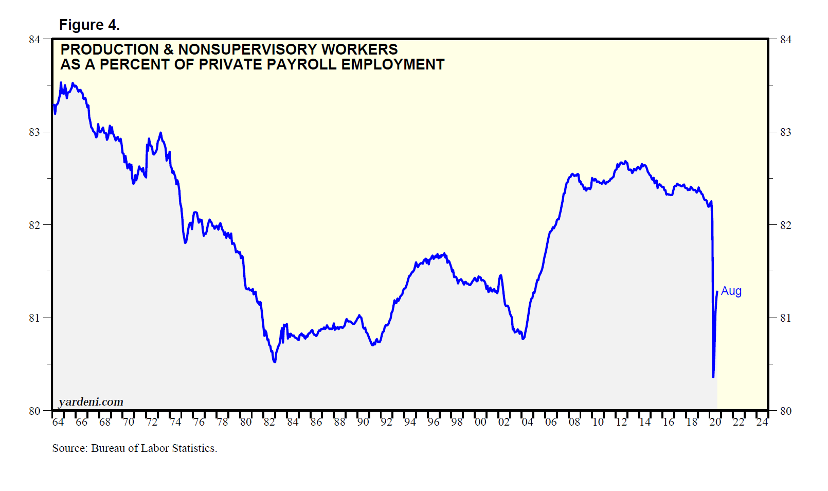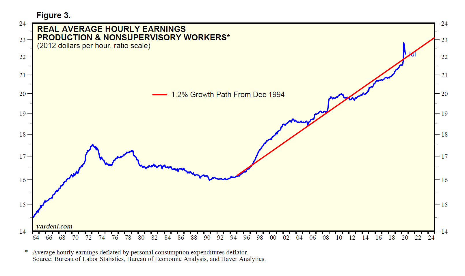 (3) Los salarios por hora reales también desmienten el mito del estancamiento. Otra serie de datos que refuta la afirmación de estancamiento de pesimistas y progresistas es el salario medio por hora (AHE), reflejado en el informe de empleo mensual y reflejado en los datos de ingresos de BEA. Ajustarlo por inflación utilizando el PCED muestra que se disparó durante la segunda mitad de la década de 1960 hasta principios de 1970 ( Fig. 3 ). Luego se estancó durante el resto de la década de 1970 hasta mediados de 1995 como resultado de lo que entonces se llamó “desindustrialización”. Desde diciembre de 1994, ha ido aumentando a lo largo de una senda de crecimiento del 1,2% anual. Esa es una tasa de crecimiento significativa en el poder adquisitivo de los consumidores, ya que el AHE real se combinó con un aumento del 37,2% desde diciembre de 1994 hasta julio de este año. ¡Eso coincide con la revolución de la alta tecnología, sobre la que he estado escribiendo desde 1993!