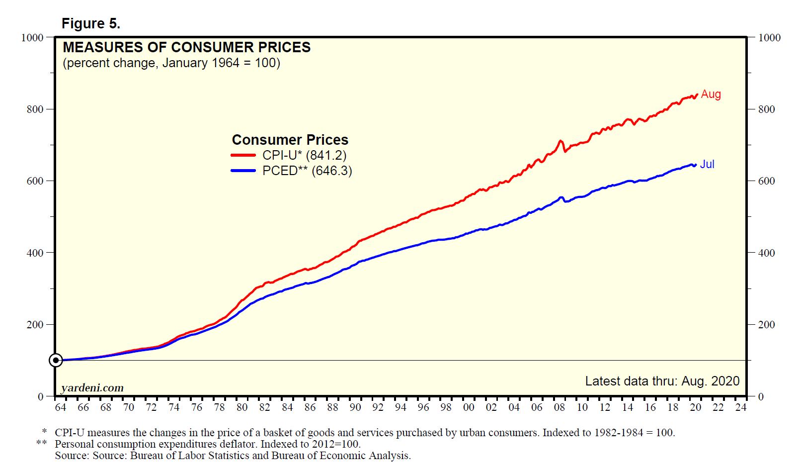 (4) El IPC es muy engañoso. Es bien sabido que el IPC está sesgado al alza, especialmente en comparación con el PCED ( Fig.5). Desde enero de 1964 hasta julio de este año, el IPC subió un 838,5%, mientras que el PCED subió un 646,3%. Como resultado, mientras que el AHE ajustado por PCED ha aumentado en un territorio récord desde enero de 1999, la versión ajustada por IPC no se recuperó a su máximo histórico anterior durante enero de 1973 hasta abril de 2020, lo que no tiene ningún sentido ( Fig. 6 ) (¡Un estudio extremadamente defectuoso de agosto de 2018 realizado por el Pew Research Center concluyó que el poder adquisitivo de los estadounidenses basado en el AHE ajustado al IPC apenas se ha movido en 40 años!)