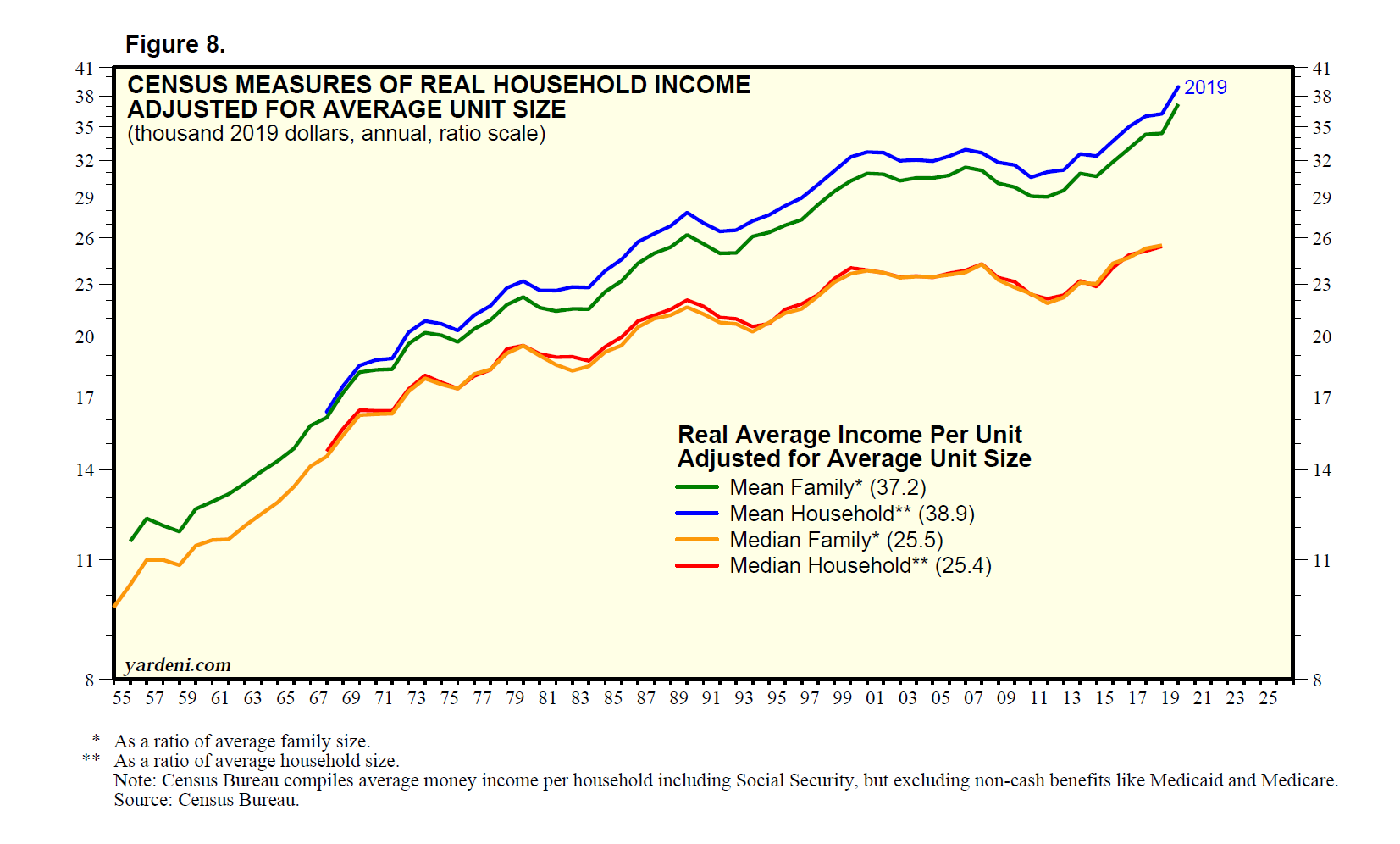 Mi opinión ha sido que muchos otros indicadores de ingresos más confiables confirman que el nivel de vida ha mejorado para la mayoría de los estadounidenses durante muchos años. Ahora incluso la serie del Censo confirma mi historia. Así que está de nuevo en el camino correcto después de mostrar engañosamente un estancamiento desde 2000 hasta 2016 ( Fig.1). La serie mediana de hogares, que se ajusta a la inflación utilizando el IPC, ha subido un 9,2% entre 2016 y 2019 y alcanzó nuevos máximos durante cada uno de los últimos tres años (2017-19) después de permanecer estable entre 2000 y 2016.
