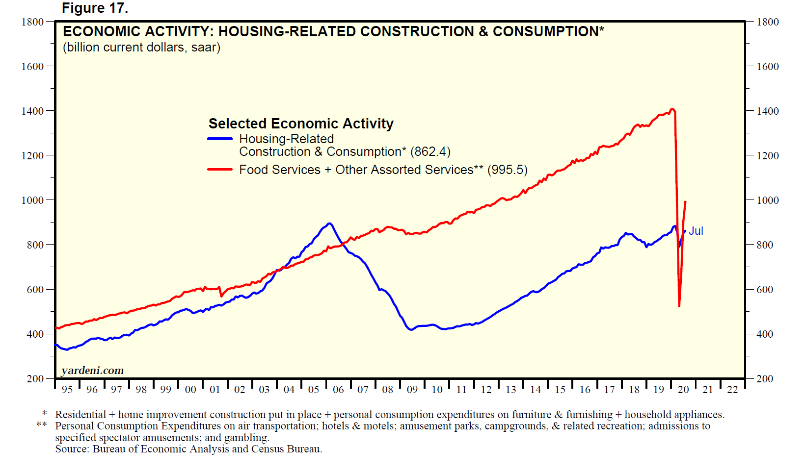 Entre las industrias que tienen más probabilidades de enfrentar una recuperación desafiante se encuentran las cubiertas por las siguientes categorías de gastos de consumo personal: transporte aéreo, hoteles y moteles, servicios de alimentos, parques de diversiones y recreación relacionada, admisión a diversiones especiales para espectadores y juegos de azar. En total, estas categorías sumaron $ 996 mil millones (saar) durante julio, mientras que la construcción y el consumo relacionados con la vivienda totalizaron $ 862 mil millones. Si bien la reciente recuperación en el primero podría estancarse hasta que haya una vacuna disponible, es probable que el segundo aumente en los próximos meses ( Fig. 17 ).