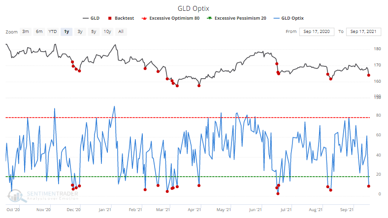 Menos brillante. El índice de optimismo del fondo de oro GLD cayó por debajo del 11,5% el jueves, uno de sus niveles más bajos en un año. Nuestro motor de backtest muestra que GLD se recuperó durante la semana siguiente después de 13 de las 16 señales anteriores.