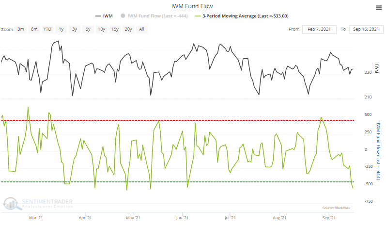Ve a lo grande o vete a casa. Durante las últimas 3 sesiones, el ETF de pequeña capitalización de IWM ha perdido un promedio de más de $ 500 millones en activos por día. Esa es la segunda cantidad más grande desde que las empresas de pequeña capitalización ingresaron a su rango de negociación en febrero.