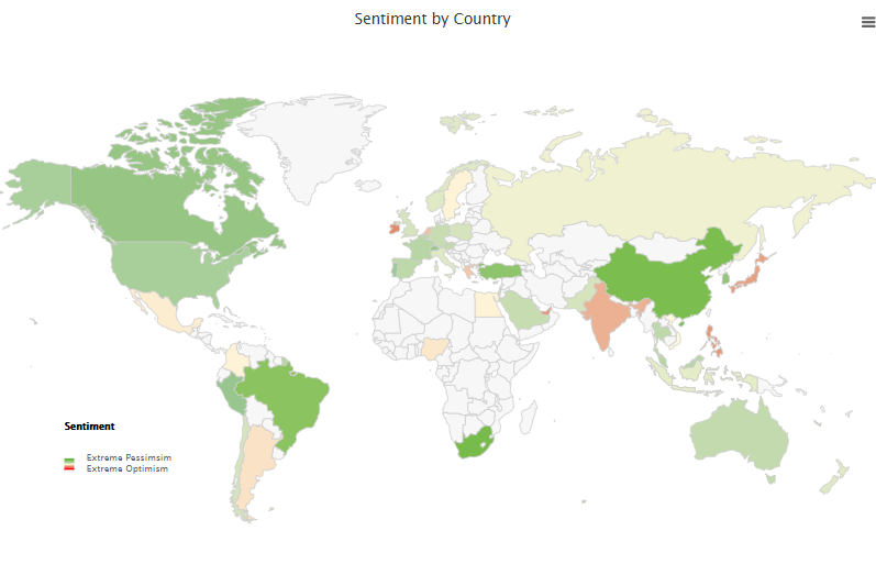 Un mundo mayoritariamente pesimista. Nuestro mapa geográfico del índice de optimismo muestra que los inversores en la mayor parte del mundo están mostrando pesimismo (cuanto más profundo es el color verde, más pesimismo). Se ven focos de optimismo en Asia, incluidos India y Japón.