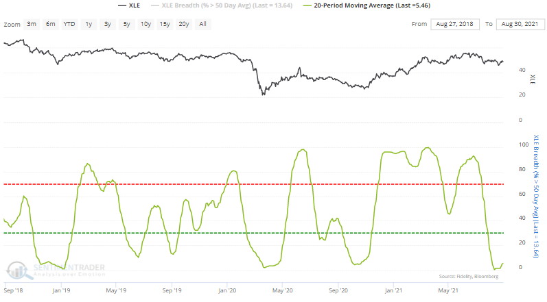 Rizarlo. Por quinta vez en más de 20 años, un promedio de 20 días en acciones de energía que cotizan por encima de sus promedios móviles de 50 días está subiendo desde cero.