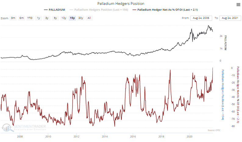 El otro metal blanco. Los coberturistas comerciales de futuros de paladio mantienen más interés abierto neto a largo que a corto por primera vez en 15 años.