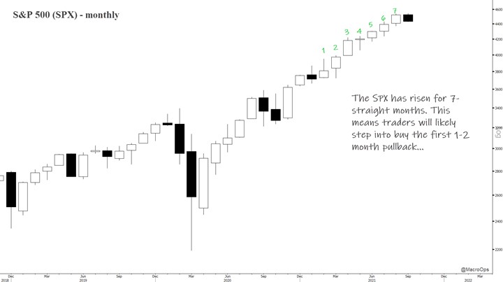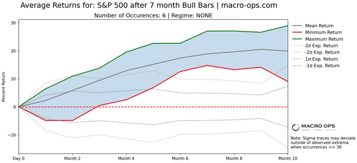 Siete barras alcistas mensuales consecutivas en el SPX son raras. Solo ha sucedido otras seis veces. Sólo en una ocasión se han dado nueve barras de apoyo, y nunca diez. Nuestro back tester muestra un sesgo alcista a largo plazo, pero con altas probabilidades de debilidad durante los próximos 0-3 meses.
