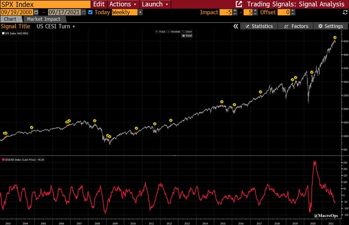 Además, los datos económicos se han debilitado en relación con las expectativas desde principios de año. El Citi US Economic Surprise Index (CESI) está subiendo desde el extremo inferior de su rango histórico. Hice una prueba retrospectiva para ver los rendimientos históricos de SPX después de un giro en CESI por encima de una lectura de -50 (momentos pasados marcados en amarillo).