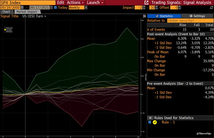 La mejora de los datos en relación con las expectativas suele ser un buen telón de fondo para los activos de riesgo. El SPX obtuvo rendimientos positivos en 15 de 18 ocasiones durante los siguientes dos meses, con ganancias promedio del 4.7%.