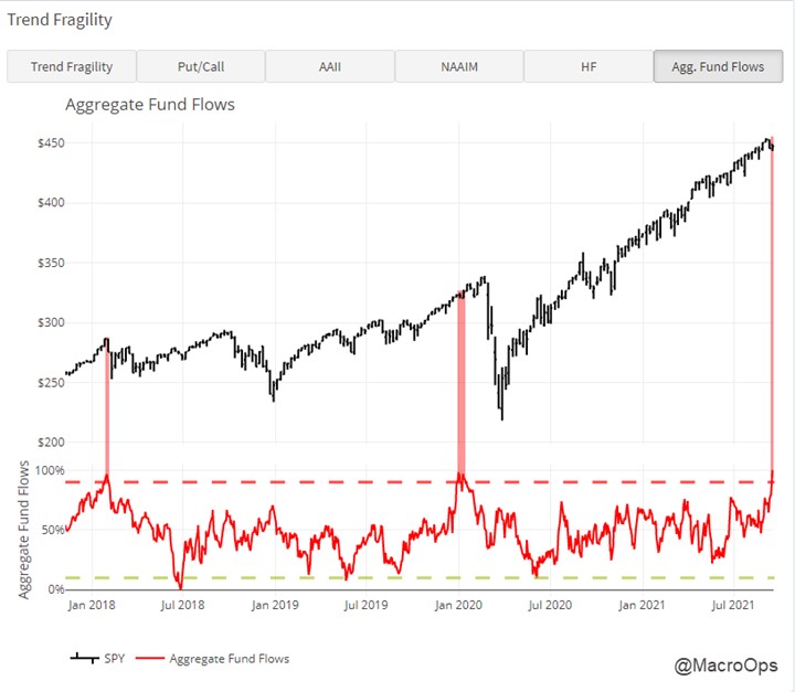 Uno de los componentes de nuestro indicador Trend Fragility son los flujos de fondos estadounidenses agregados. Estos flujos subieron al percentil 99 la semana pasada. La última vez que los flujos de fondos estuvieron cerca de estos niveles fue en febrero de 2020 y enero de 2018.