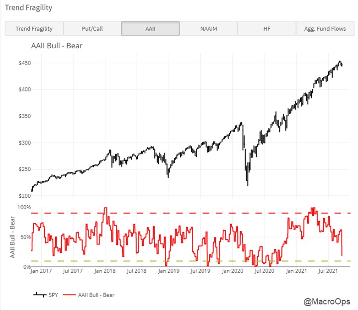Por lo general, este tipo de acumulación en las acciones de EE. UU. va acompañado de un sentimiento igualmente fuerte. Pero ese no es el caso, al menos no cuando se mira el sentimiento AAII Bull-Bear que cayó la semana pasada a su nivel más bajo en 12 meses.
