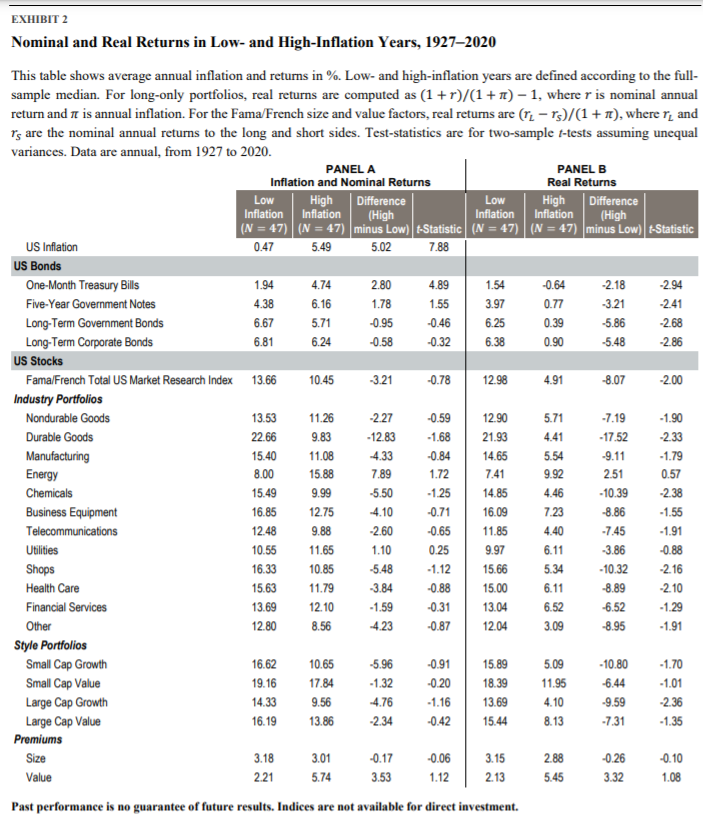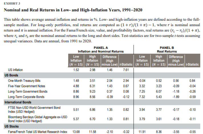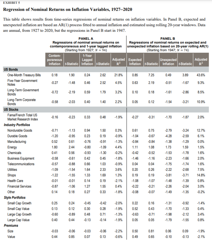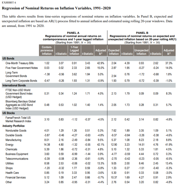 “Estudiamos la relación empírica entre la inflación y el desempeño de diferentes clases de activos. Adoptamos el punto de vista de un inversor estadounidense con un conjunto de oportunidades de inversión global y analizamos cómo los rendimientos de los valores gubernamentales, bonos corporativos, acciones, carteras de la industria, factores de tamaño / valor / rentabilidad, REIT y materias primas han variado con la inflación, incluida la esperada. e inflación inesperada.”