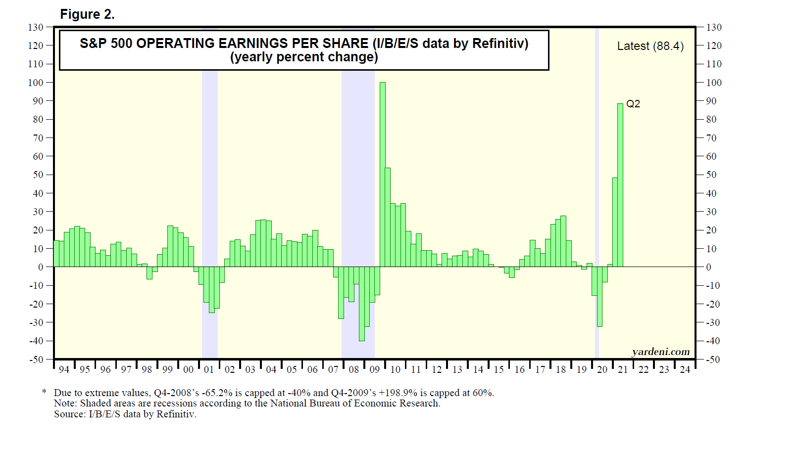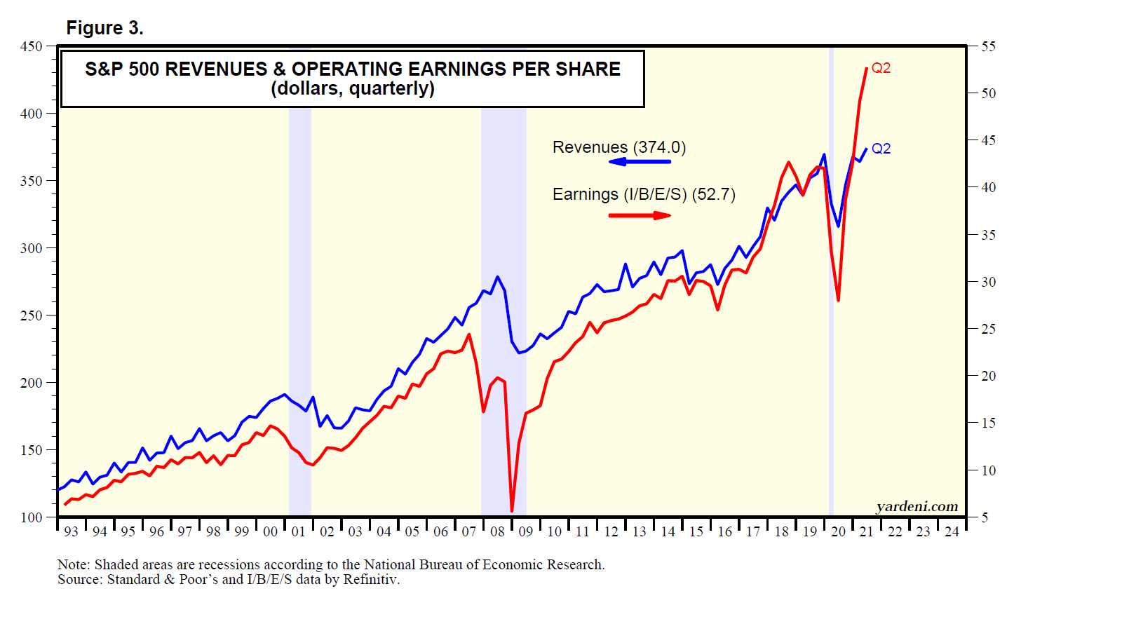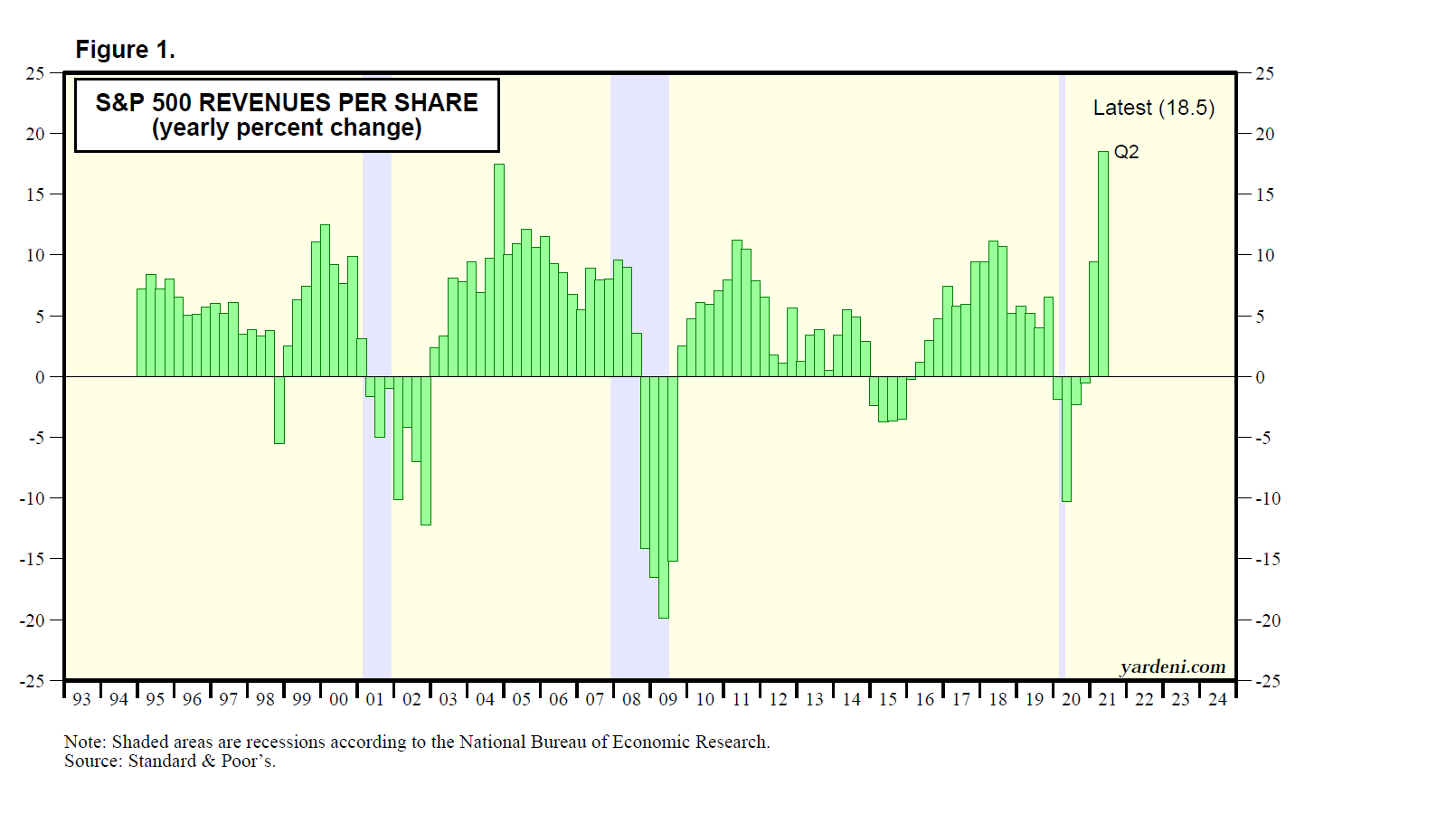 - La semana pasada nos impresionó la publicación de Standard & Poor’s de los ingresos por acción y las ganancias por acción del S&P 500. El primer dato subió un 18,5% interanual, mientras que el segundo se disparó un 88,4% interanual (Fig. 1 y Fig. 2). Es probable que ambos marquen picos cíclicos en estas tasas de crecimiento durante un tiempo. Sin embargo, ambos deberían continuar creciendo hasta 2023. Aquí están nuestras tasas de crecimiento proyectadas para los ingresos y ganancias del S&P 500 durante 2021 (18%, 47%), 2022 (3%, 5%) y 2023 (3%, 7%).
