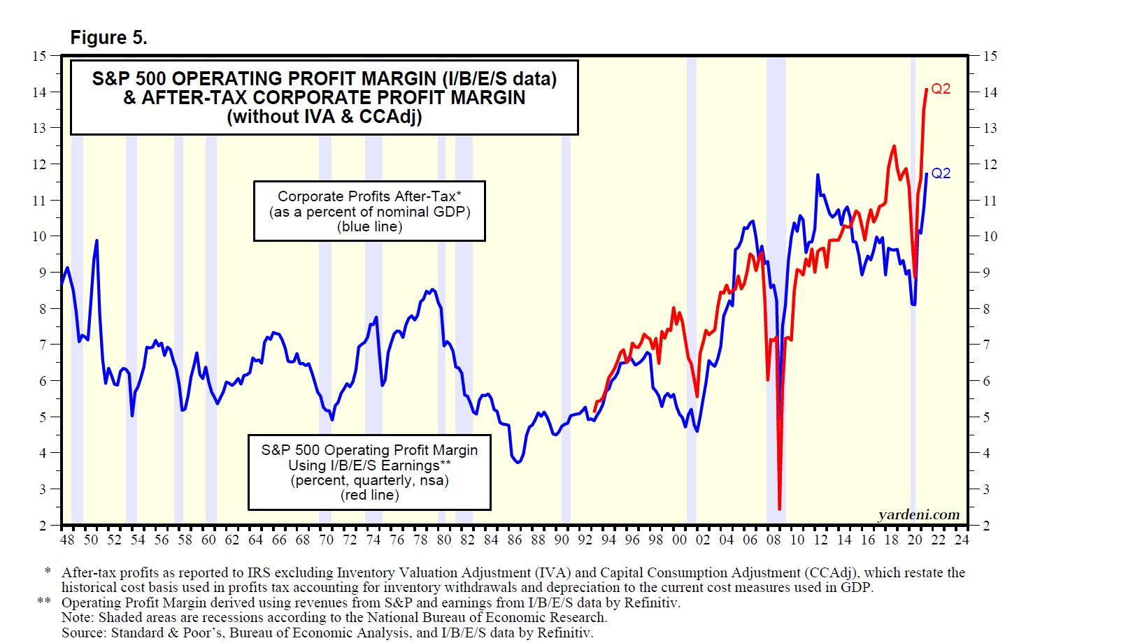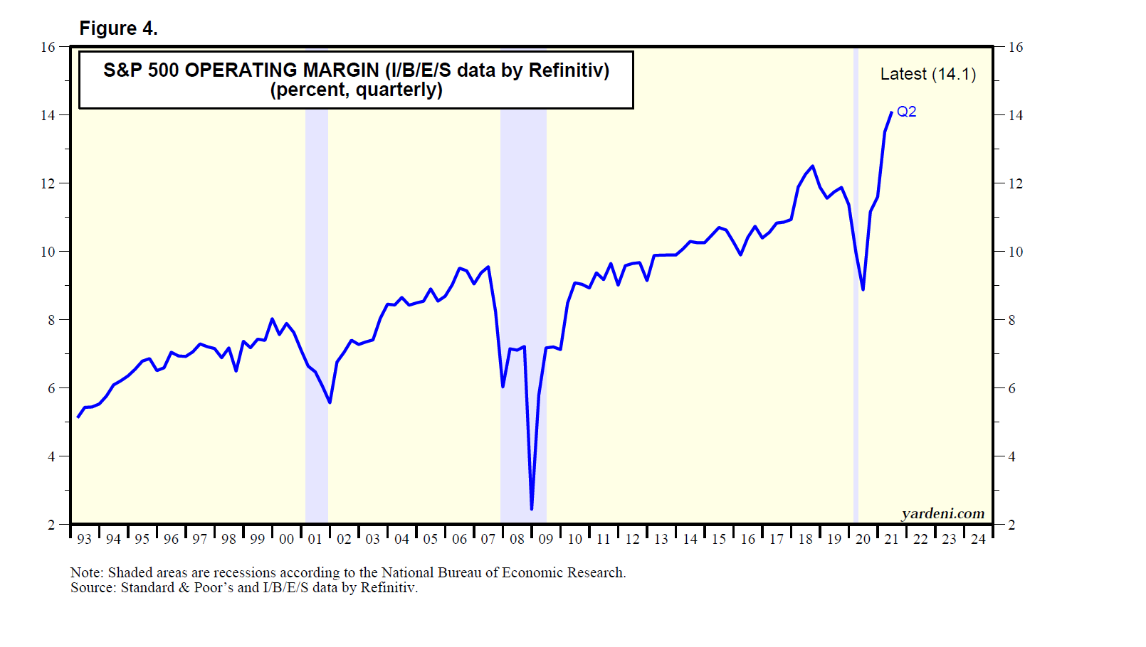 Podemos utilizar las dos series para calcular el margen de beneficio del S&P 500 (Fig. 3 y Fig. 4). Antes de la pandemia, el margen alcanzó un máximo histórico del 12,5% durante el tercer trimestre de 2018. El recorte de impuestos corporativos del presidente Donald Trump fue un gran impulso del margen ese año. Como resultado de la pandemia, el margen cayó al 8,9% durante el segundo trimestre de 2020, pero estuvo muy por encima del mínimo del 2,4% durante la Gran Crisis Financiera (GFC). El margen se ha recuperado desde el mínimo del año pasado hasta un récord del 14,1% durante el segundo trimestre.
