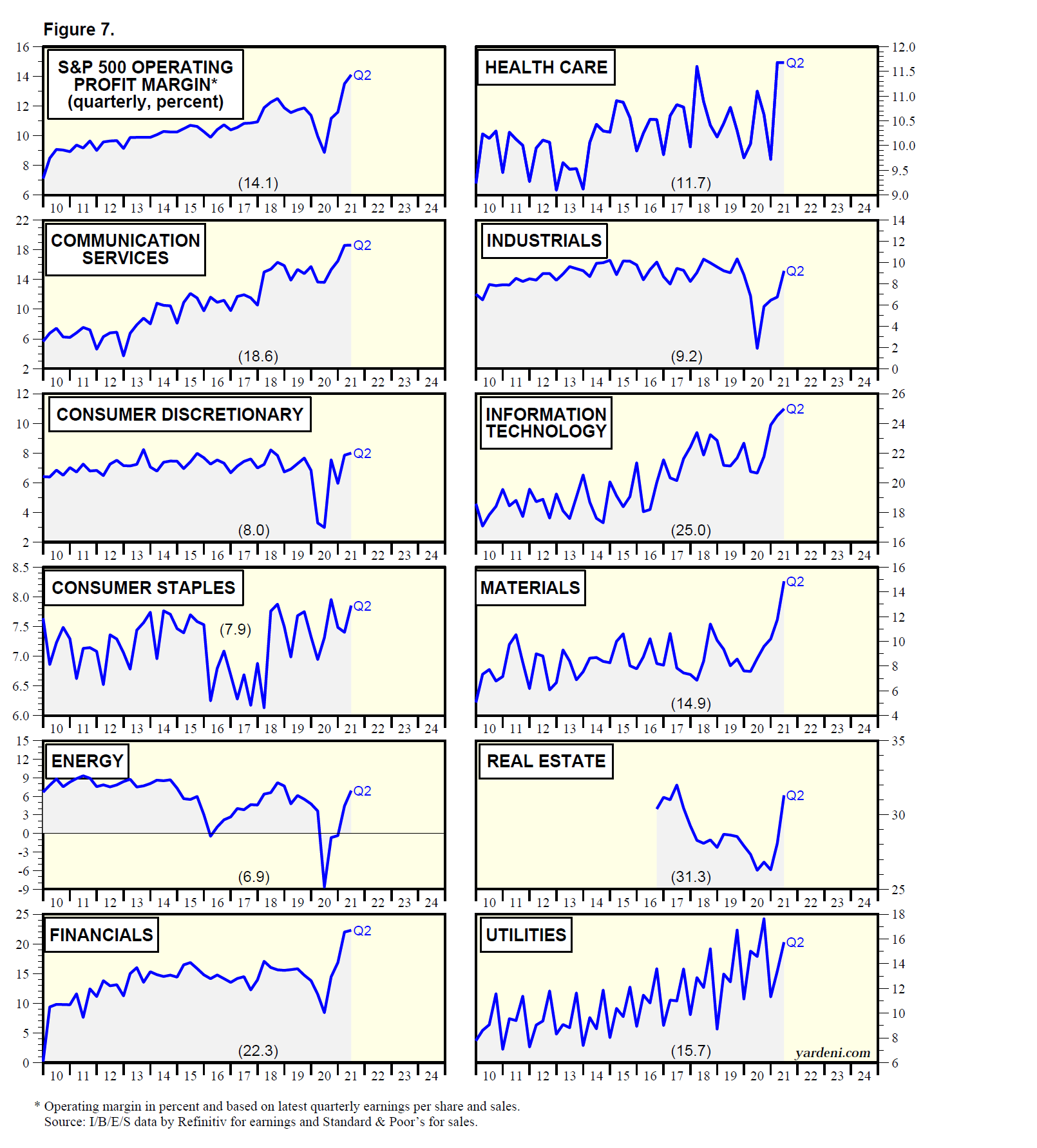 También podemos usar los datos de las Cuentas Nacionales de Ingresos y Productos (NIPA) para calcular los márgenes de ganancia. Las utilidades contables corporativas después de impuestos divididas por el PIB nominal también subieron a un máximo histórico de 11,8% durante el segundo trimestre, frente al 8,1% de hace un año (Fig. 5). ¿Por qué la divergencia entre esta medida del margen y la del S&P 500? Las dos series generalmente han seguido el mismo camino, aunque divergen, como lo hicieron en los años entre la GFC y la Gran Crisis del (Corona) Virus.