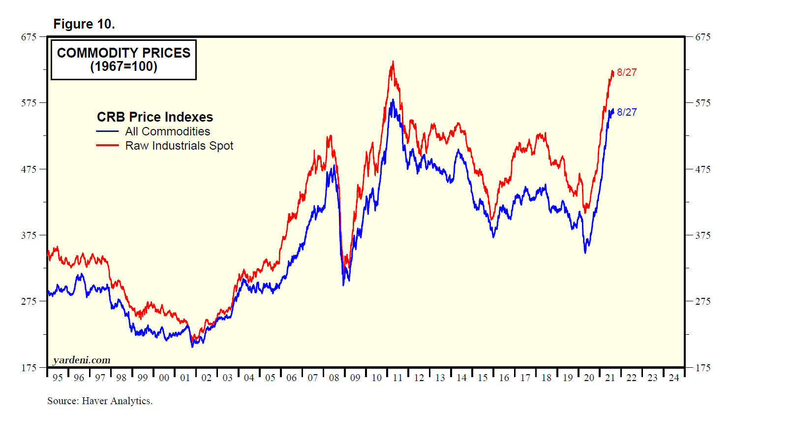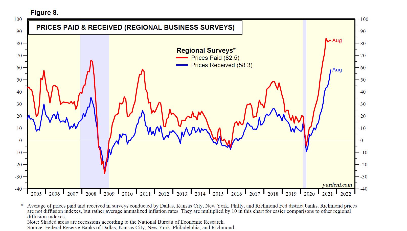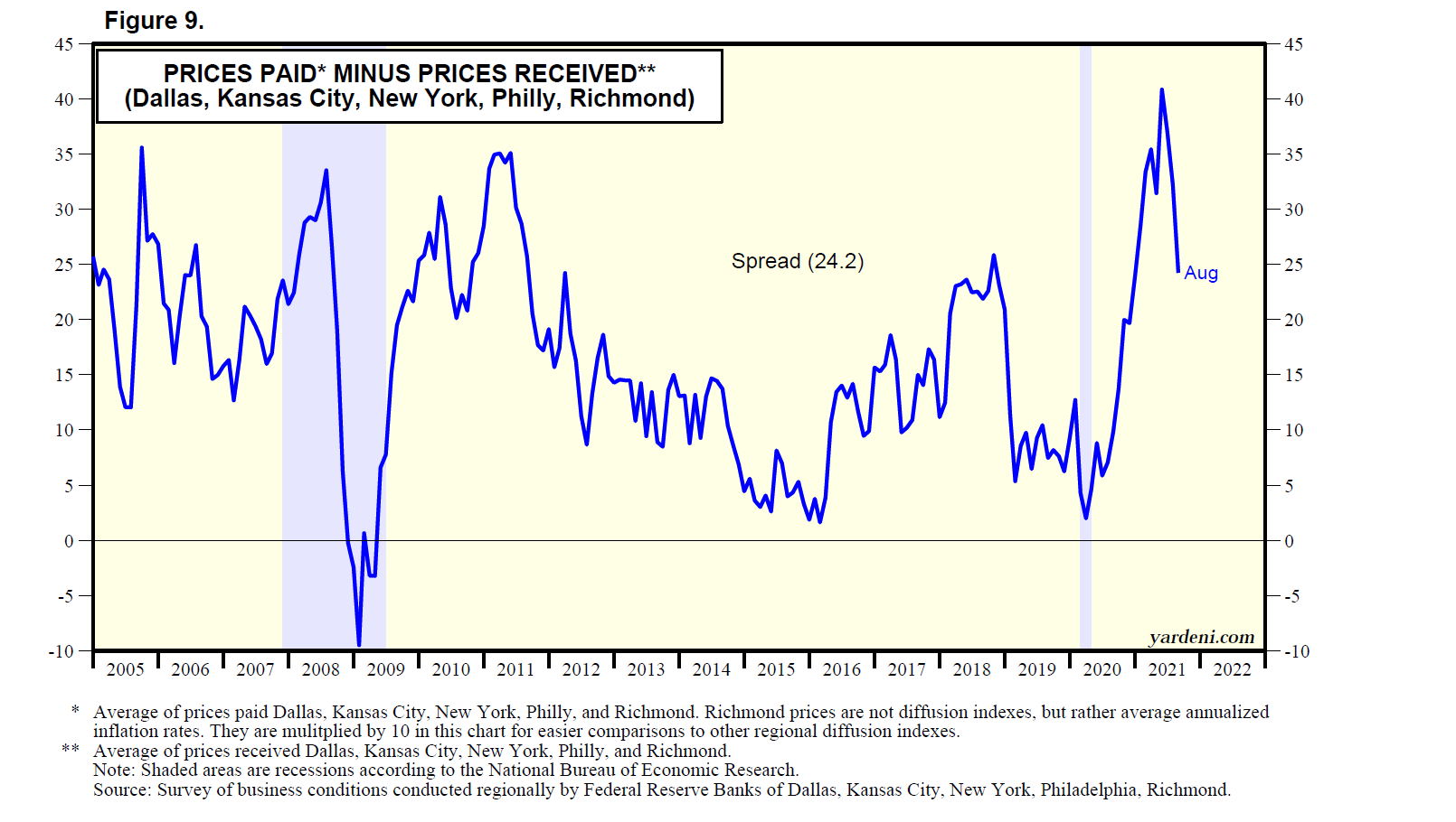 Ahora tenemos datos de agosto para las encuestas comerciales regionales realizadas por cinco de los bancos regionales de la Reserva Federal. El promedio de los índices de precios pagados se ha disparado desde un mínimo de -4,9 el año pasado durante abril a un máximo histórico de 84,1 en mayo (Fig. 8). Se ha estabilizado alrededor de ese nivel hasta agosto.