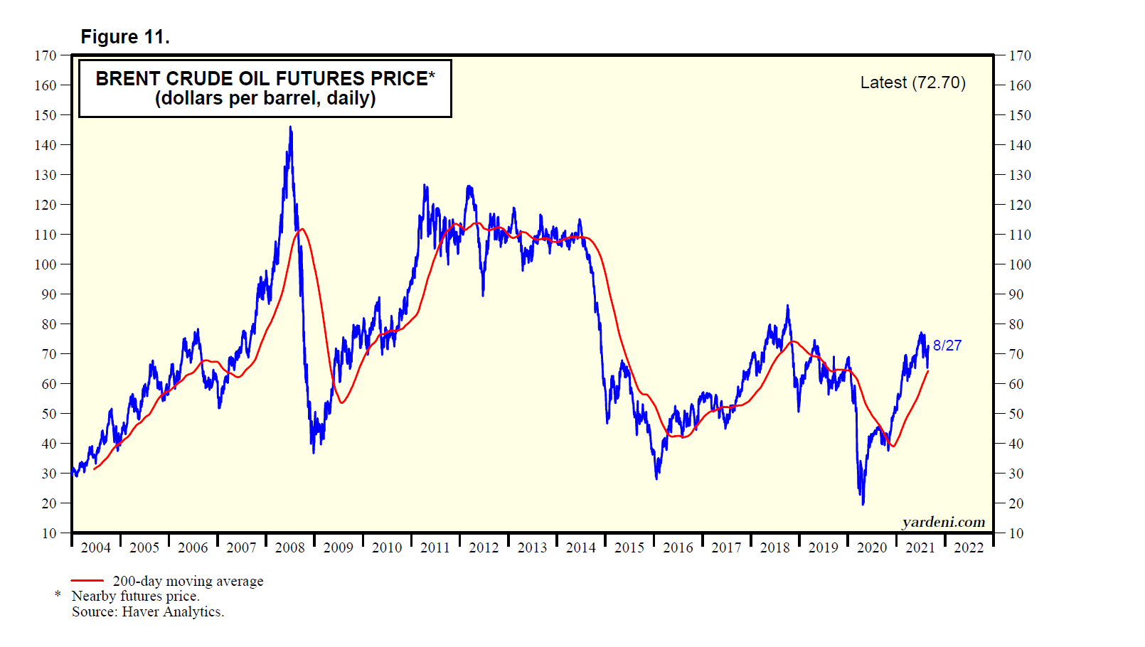 El aparente máximo del índice de precios pagados promedio sugiere que el índice CRB de todos los productos básicos y el índice CRB de precios al contado industriales crudos pueden estar comenzando a alcanzar su punto máximo (Fig. 10). Lo mismo puede decirse del precio del crudo (Fig. 11). Si es así, eso podría atribuirse a una desaceleración de la actividad económica resultante de una combinación de la última ola de la pandemia en todo el mundo y la escasez de repuestos, que también están parcialmente relacionados con la pandemia.