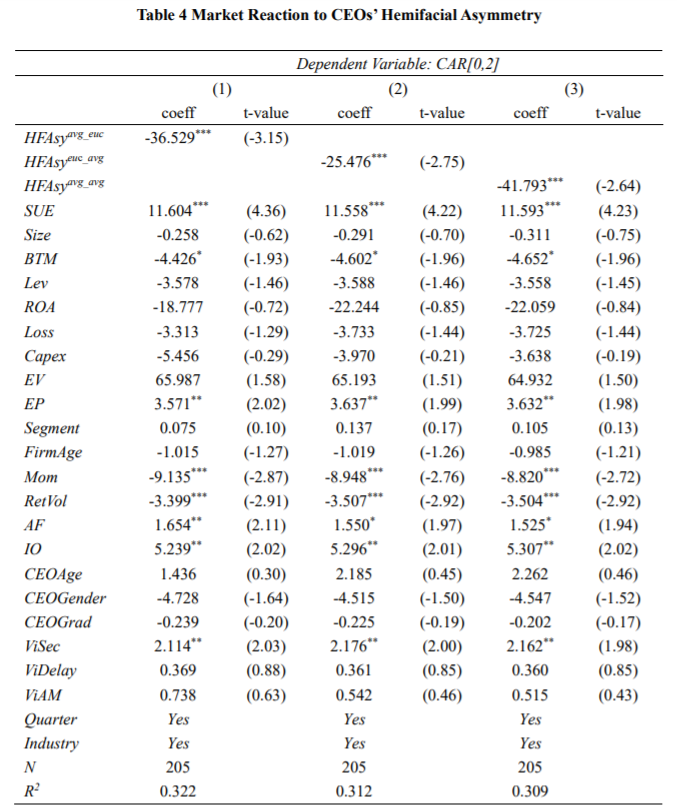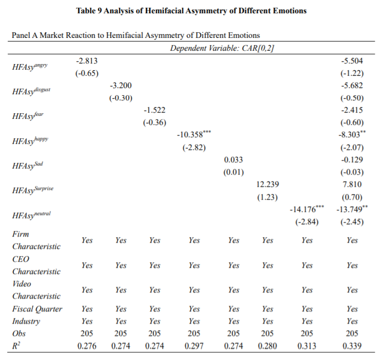“Basándonos en evidencia previa de estudios neuropsicológicos, investigamos si el HFAsy dinámico de los CEO induce la desconfianza de los inversores y afecta su comportamiento comercial. Primero examinamos la reacción del mercado de valores a la dinámica HFAsy de los directores ejecutivos que se muestra en los videos de entrevistas. Dado que el alto HFAsy de los directores ejecutivos induce la desconfianza de los inversores, los inversores pueden percibir a estos directores ejecutivos como gerentes autosuficientes que tienden a sacrificar el interés de los accionistas por su beneficio personal.”