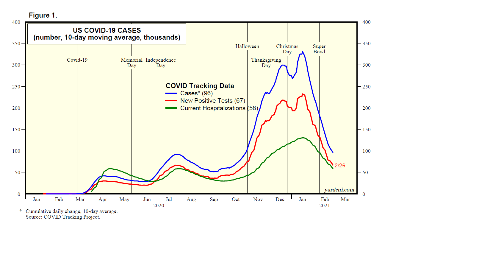 Sobre una base de promedio móvil de 10 días, las hospitalizaciones por Covid-19 se han desplomado un 55% desde un máximo histórico de 130.386 durante el 15 de enero a 58.394 durante el 26 de febrero ( Fig.1). Ese es el ritmo más bajo desde el 12 de noviembre de 2020. El 27 de febrero, la Administración de Alimentos y Medicamentos autorizó la vacuna Covid-19 de una sola dosis de Johnson & Johnson para su uso de emergencia. J&J proporcionará a los EE. UU. 100 millones de dosis a fines de junio. Cuando se combinan con los 600 millones de dosis de las vacunas de dos inyecciones fabricadas por Pfizer-BioNTech y Moderna programadas para llegar a fines de julio, habrá inyecciones más que suficientes para cubrir a cualquier adulto estadounidense que quiera una este verano.