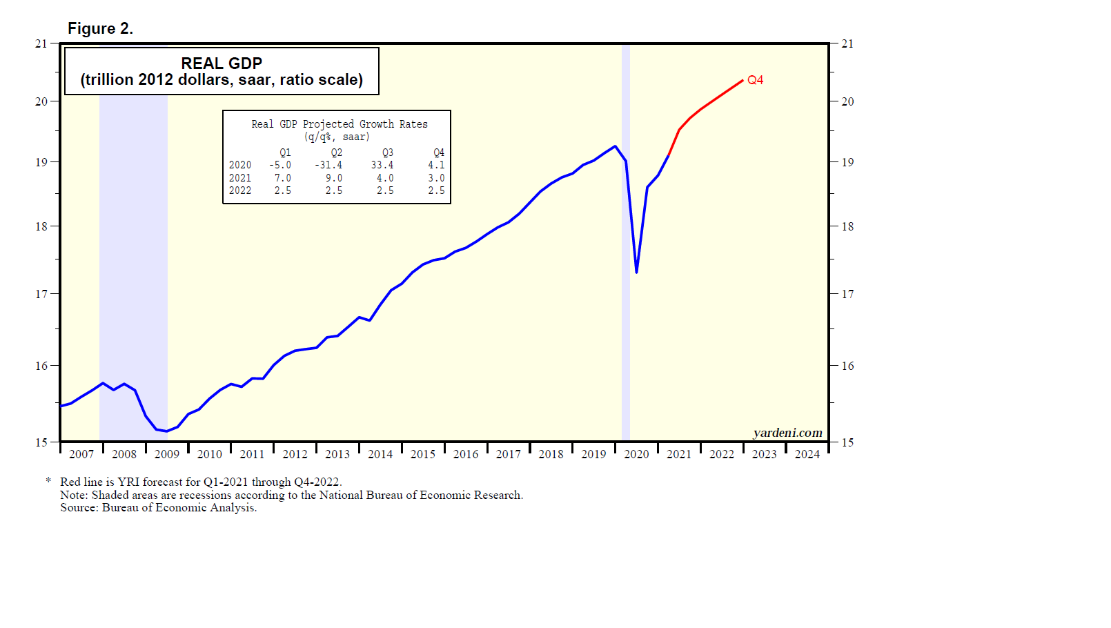 El plan proporcionará cheques de $ 1.400 por persona apta para este programa, principalmente durante abril. Estimamos que esto proporcione otro gran impulso a los ingresos y gastos de los consumidores. El año pasado, el gasto de los consumidores en el PIB real aumentó un 41,0% durante el tercer trimestre y un 2,4% durante el cuarto trimestre. El modelo GDPNow de la Fed de Atlanta mostró un aumento del 8,8% en dicho gasto durante el primer trimestre a partir del 1 de marzo (con un aumento del PIB real del 10,0%). Prevemos que el gasto real del consumidor aumentará un 7,9% durante el primer trimestre y un 11,3% durante el segundo.