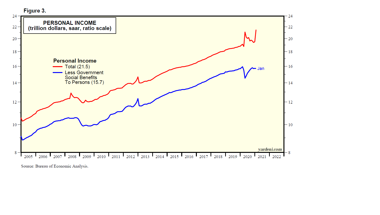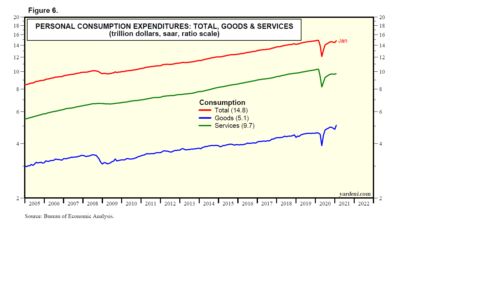 Los cheques del gobierno ciertamente contribuyeron a la recuperación en forma de V del gasto de los consumidores ( Fig.6). Otra ronda de controles hará lo mismo esta primavera. En dólares corrientes, el gasto de los consumidores aumentó 2.4% m / m durante enero, liderado por un aumento de 5.8% m / m en el consumo de bienes a un nuevo récord. En los próximos meses, los consumidores deberían poder gastar mucho más en servicios que han sido limitados por los protocolos de distanciamiento social de la pandemia.