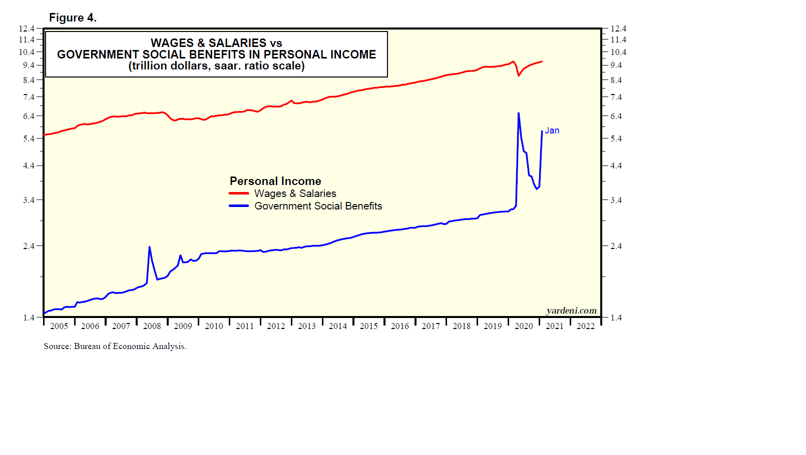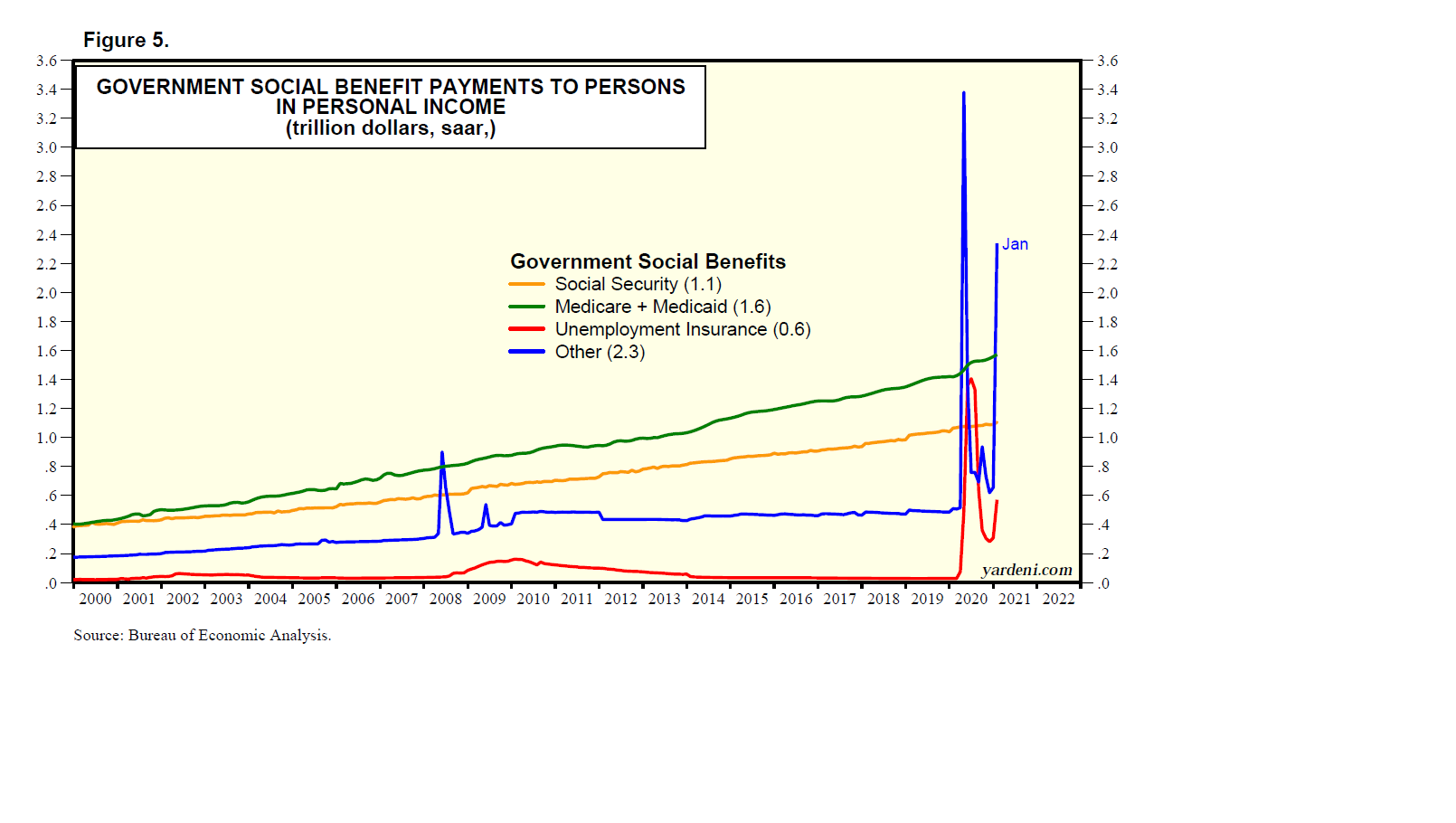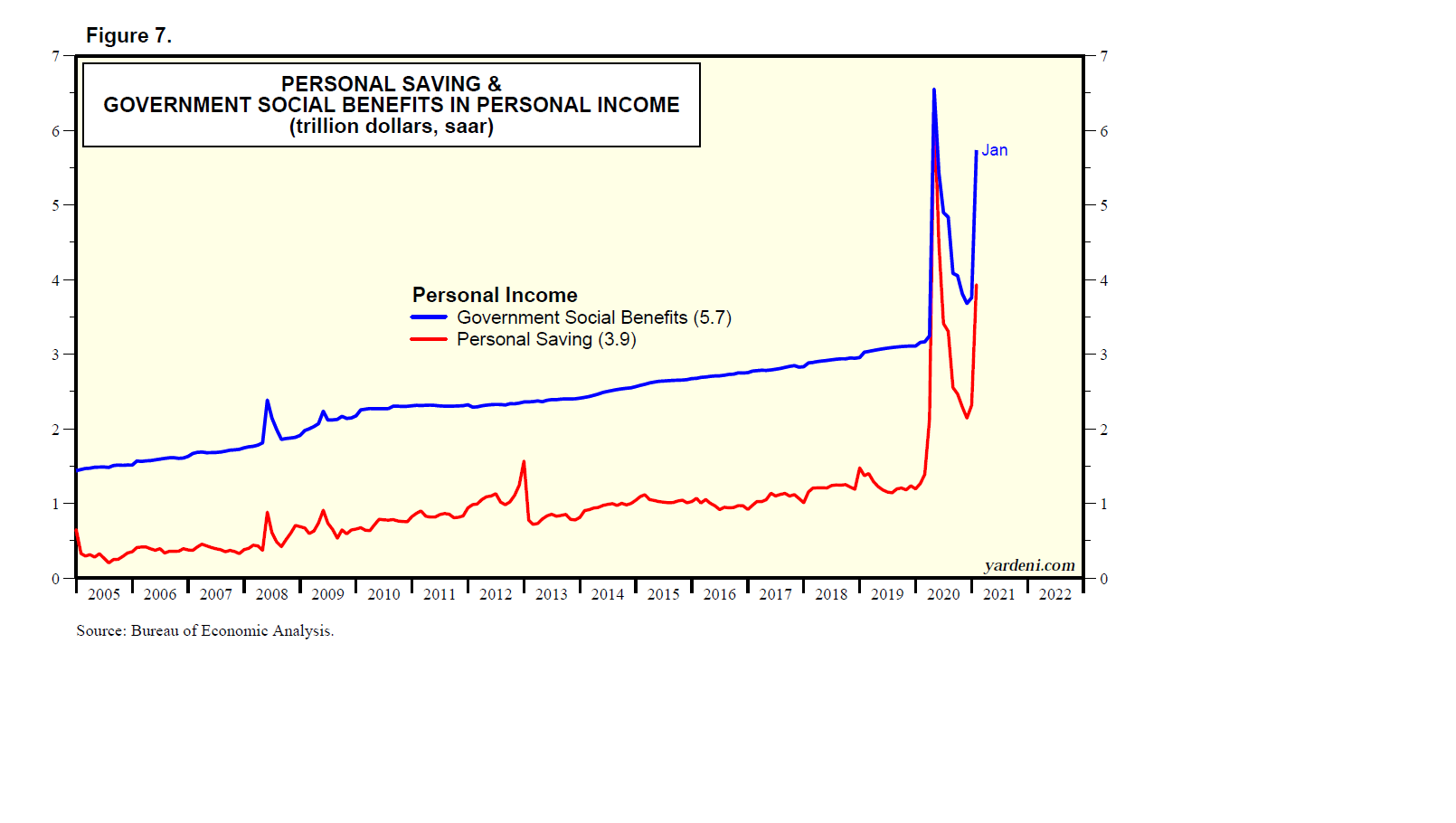 Si la próxima ronda de cheques de $ 1.400 sale en abril, ¡indudablemente aumentará los ingresos personales en una nueva cantidad récord a otro nuevo récord! El “otro” componente de los beneficios sociales del gobierno en el ingreso personal incluye un elemento para “Pagos de impacto económico” ( Fig. 5). A una tasa anual, estos cheques del Tesoro aumentaron los beneficios y el ingreso personal total en $ 2.6 billones y $ 0.6 billones, respectivamente, durante abril y mayo del año pasado. Los impulsaron a ambos en 1,7 billones de dólares durante enero. ¡Así que representaron prácticamente todo el aumento de $ 1,9 billones en ingresos personales durante enero!
