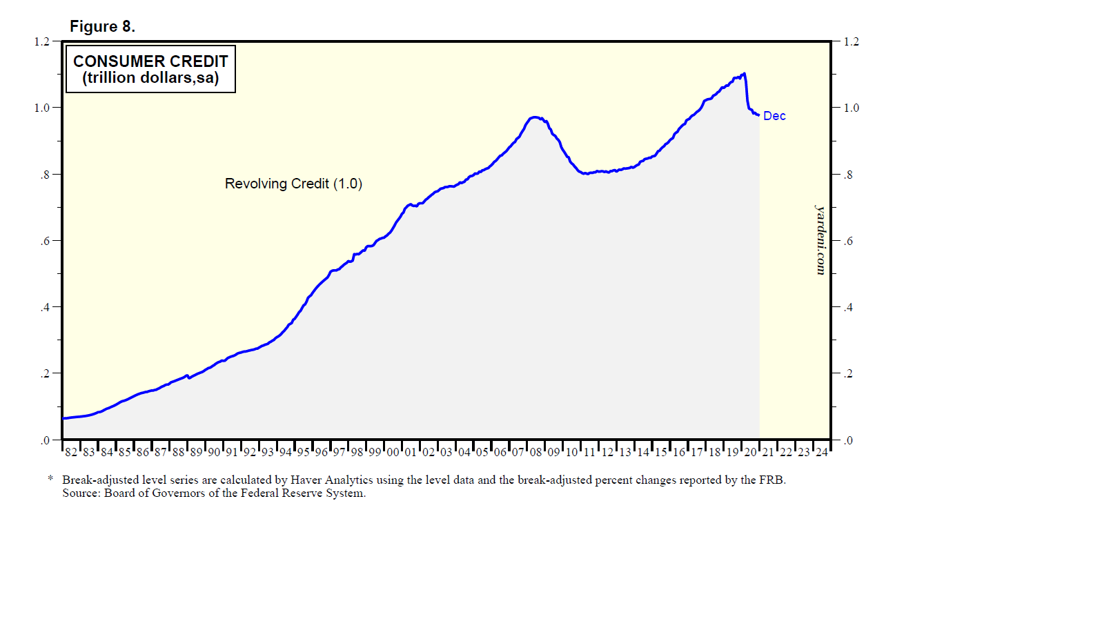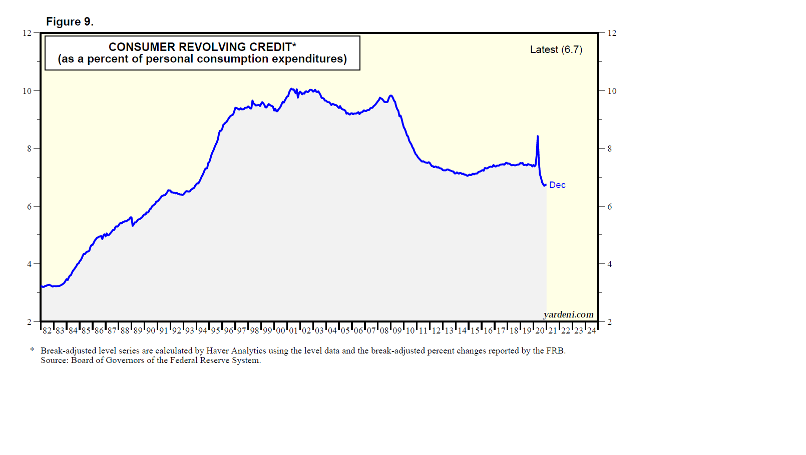 Así que queda mucho estímulo. Además, el crédito renovable de consumo pendiente disminuyó $ 118 mil millones interanual hasta diciembre a $ 976 mil millones ( Fig. 8 ). La relación entre el crédito renovable al consumo y el consumo personal (ambos en dólares corrientes) se redujo de 7,4% a 6,7% durante este período ( Fig.9). Esto sugiere que los consumidores no dependen tanto de sus tarjetas de crédito porque tienen mucho dinero en efectivo. Además, una vez que gastan su dinero extra, siempre pueden volver a acceder a sus tarjetas de crédito.