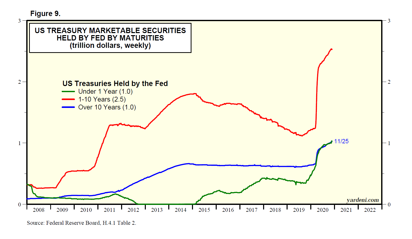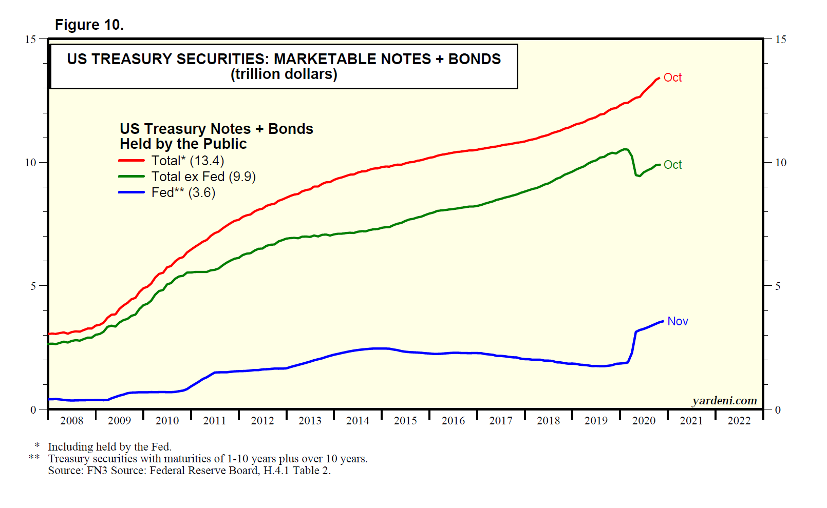 “Desde la última semana de febrero hasta la última semana de octubre, las tenencias de valores del Tesoro de la Fed aumentaron $ 2,1 billones de la siguiente manera por vencimientos: un año o menos ($ 421 mil millones), 1 a 10 años ($ 1,281 mil millones) y más de 10 años ($ 351 mil millones) ( Figura 9 ). Desde finales de febrero hasta finales de octubre, el Tesoro aumentó su deuda negociable pendiente en $ 3.4 billones de la siguiente manera: letras ($ 2,420 mil millones), pagarés ($ 735 mil millones) y bonos ($ 284 mil millones) ( Fig.10 ). En otras palabras, la Fed financió el 62% de las necesidades de financiamiento de los bonos del Tesoro en todos los vencimientos y compró $ 613 mil millones más de pagarés y bonos de los que se emitieron durante ese período ”.