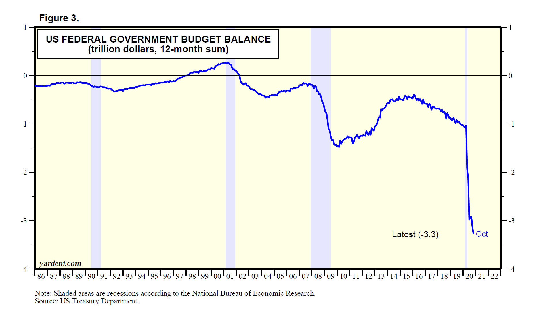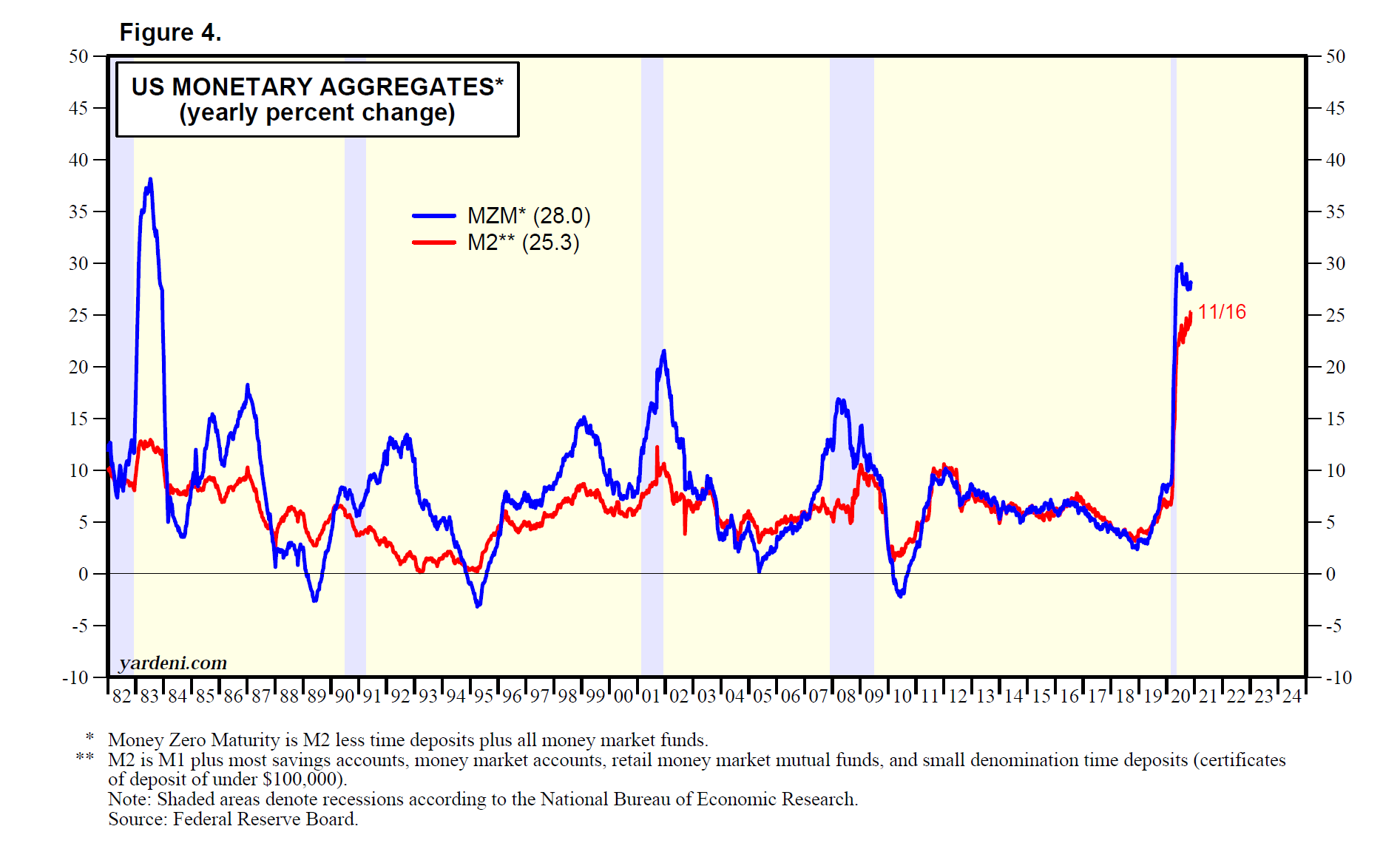 Mientras tanto, hay otros vigilantes en los mercados financieros. Los “Vigilantes del Dow” lanzaron un grito espeluznante cuando el S&P 500 se hundió un 33,9% en 33 días a principios de este año ( Fig. 1 ). La Fed respondió con QE4ever el 23 de marzo. Los “Vigilantes del Dólar” amenazan con un colapso de la moneda si las políticas fiscales y monetarias de Estados Unidos continúan aplacando a los “Vigilantes del Dow” al aumentar el déficit presupuestario federal y la oferta monetaria ( Fig. 2 , Fig. 3 , y Fig. 4 ). Una caída del dólar podría reactivar la inflación y desatar una plaga de “Bonos Zombies”.