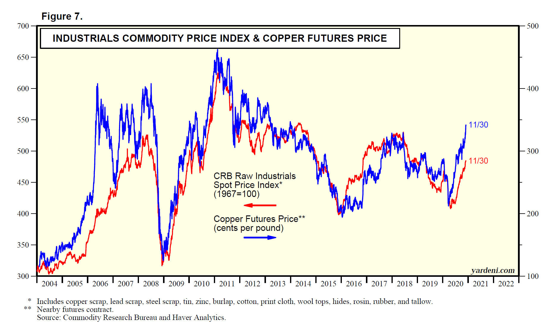 (2) Cobre. El precio del cobre es uno de los 13 componentes del índice de precios al contado de materias primas industriales CRB ( Fig. 7 ). (Los productos de petróleo y madera no están incluidos en el índice). El precio del cobre ha estado liderando el índice CRB general al alza desde el mínimo de este año. El lunes, el cobre cerró al precio más alto desde el 2 de enero de 2014. El aumento del precio del metal rojo ha sido el M-PMI de China, que se ha recuperado sólidamente durante los últimos seis meses hasta noviembre (Figura 8 ).
